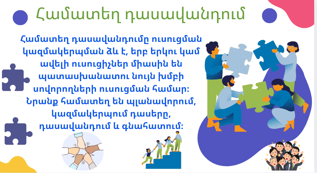 Համատեղ դասավանդման մոդելը ոչ միայն հնարավորություն է տալիս համադրել տարբեր մասնագիտական դիտանկյուններ, այլև ստեղծում է ներառական և բազմաբովանդակ ուսումնական միջավայր, որտեղ յուրաքանչյուր աշակերտ ստանում է անհատականացված և համարժեք աջակցություն։