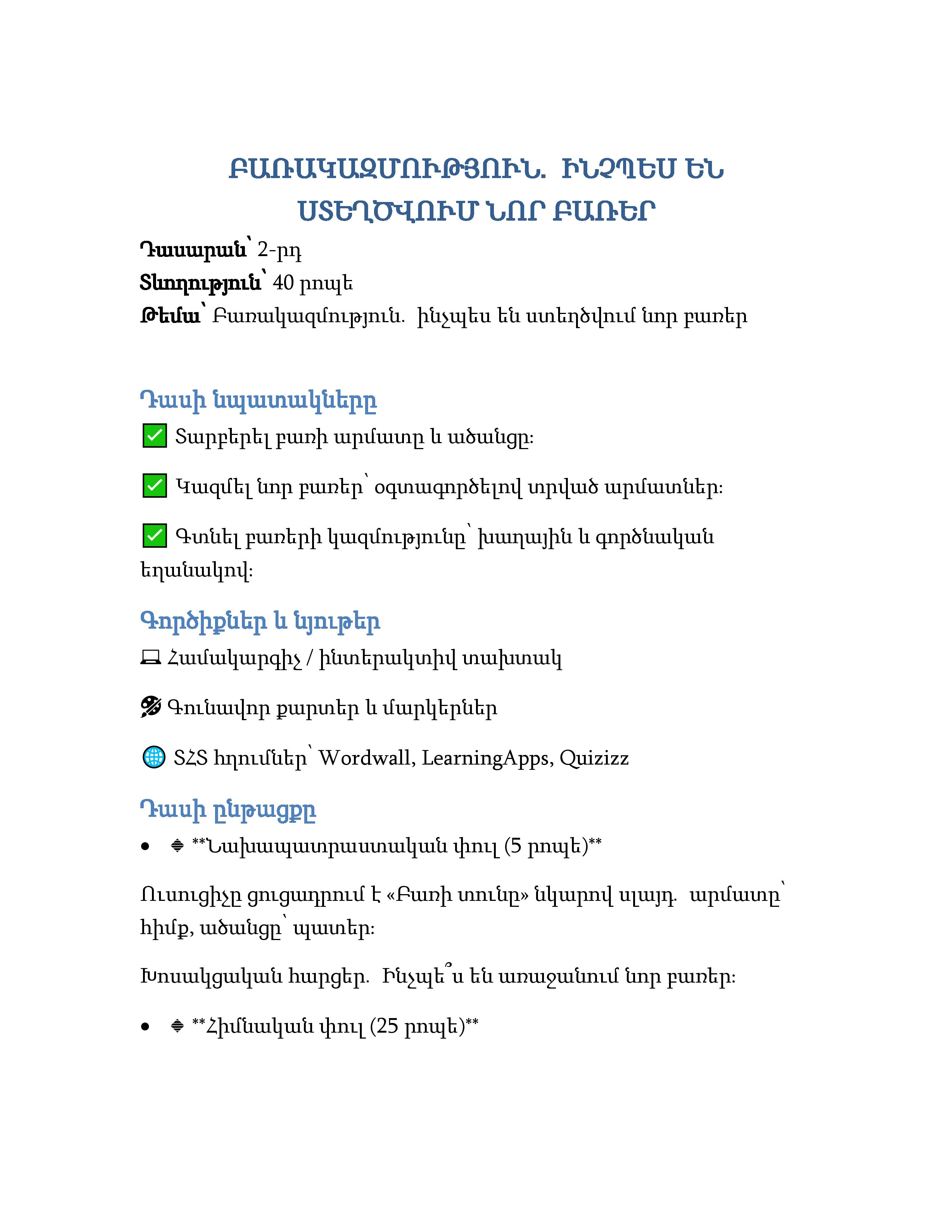 Դասընթացի միջոցով սովորողները կարժևորեն մայրենի լեզվի դերը,կզարգացնեն պատկերավորման միջոցները, կամրապնդեն բառակազմական գիտելիքները։